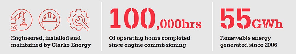 • The single Jenbacher JGS 320 gas engine has completed 100,000 hours of operation, generating 55GWh of renewable power since commissioning in 2006.