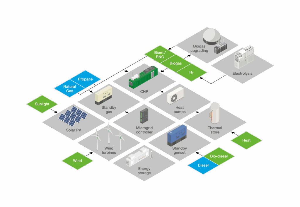 Operable on biogas, biomethane, or hydrogen blends for low-carbon operation.