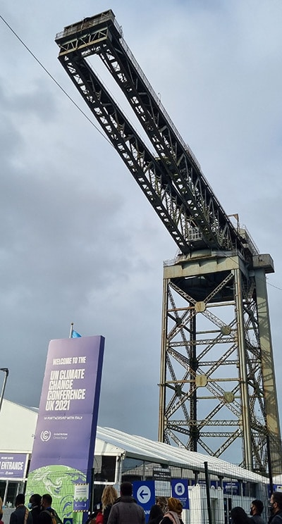 - Entrance to COP26 Blue Zone plus crane from the historic docks in Glasgow