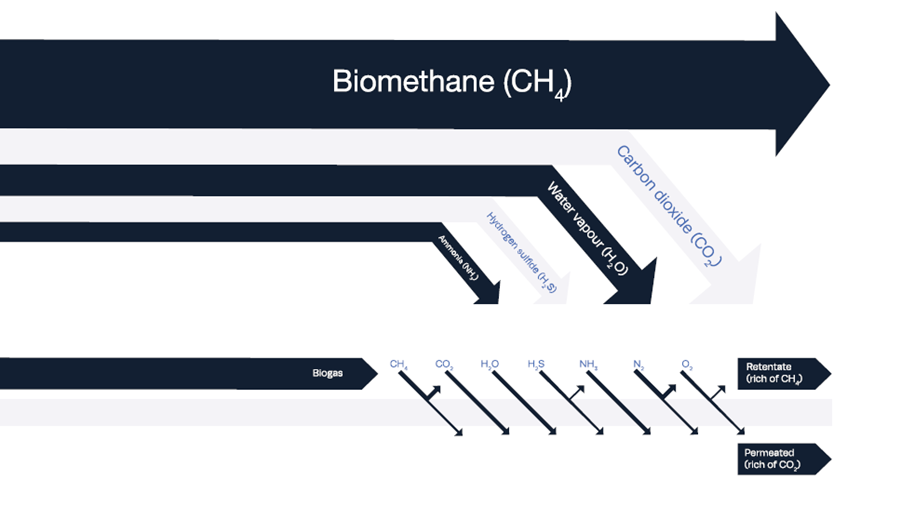 Advanced membrane and solvent-based technologies remove CO₂, H₂O, H₂S, NH₃, N₂, and O₂ from biogas. The technology is selected based on application and gas composition.