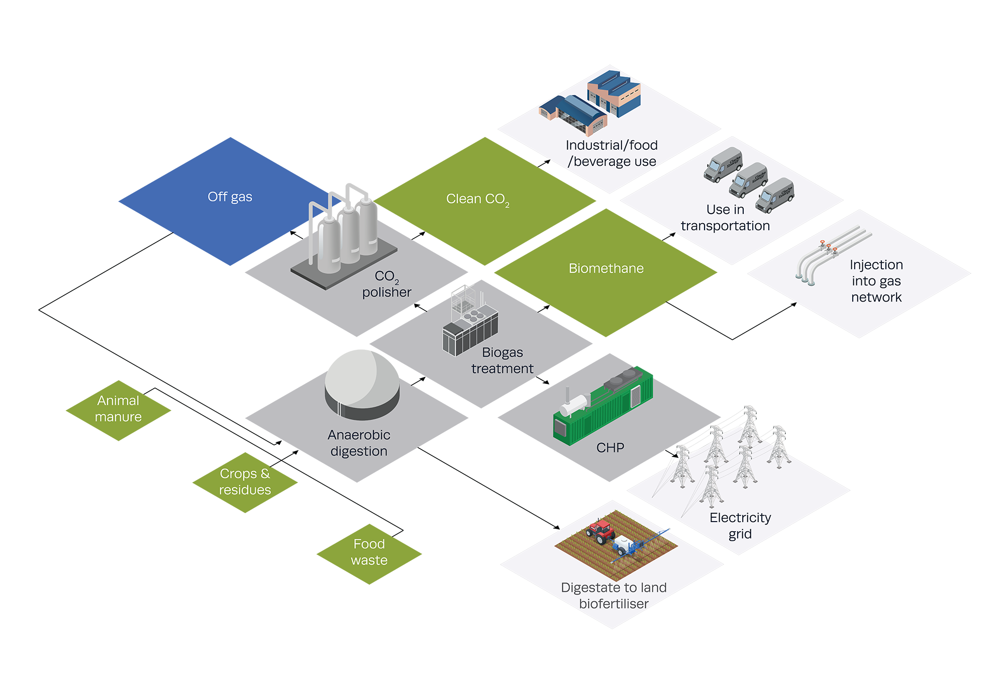 Biomethane can power CHP systems, while CO₂ from the upgrading process can be recovered and purified for use in sectors like food and beverage. As biogas is a renewable fuel, if the CO2 is recovered and sequestered, carbon dioxide can be removed from the atmosphere, creating an atmospheric net-carbon reducing energy technology.